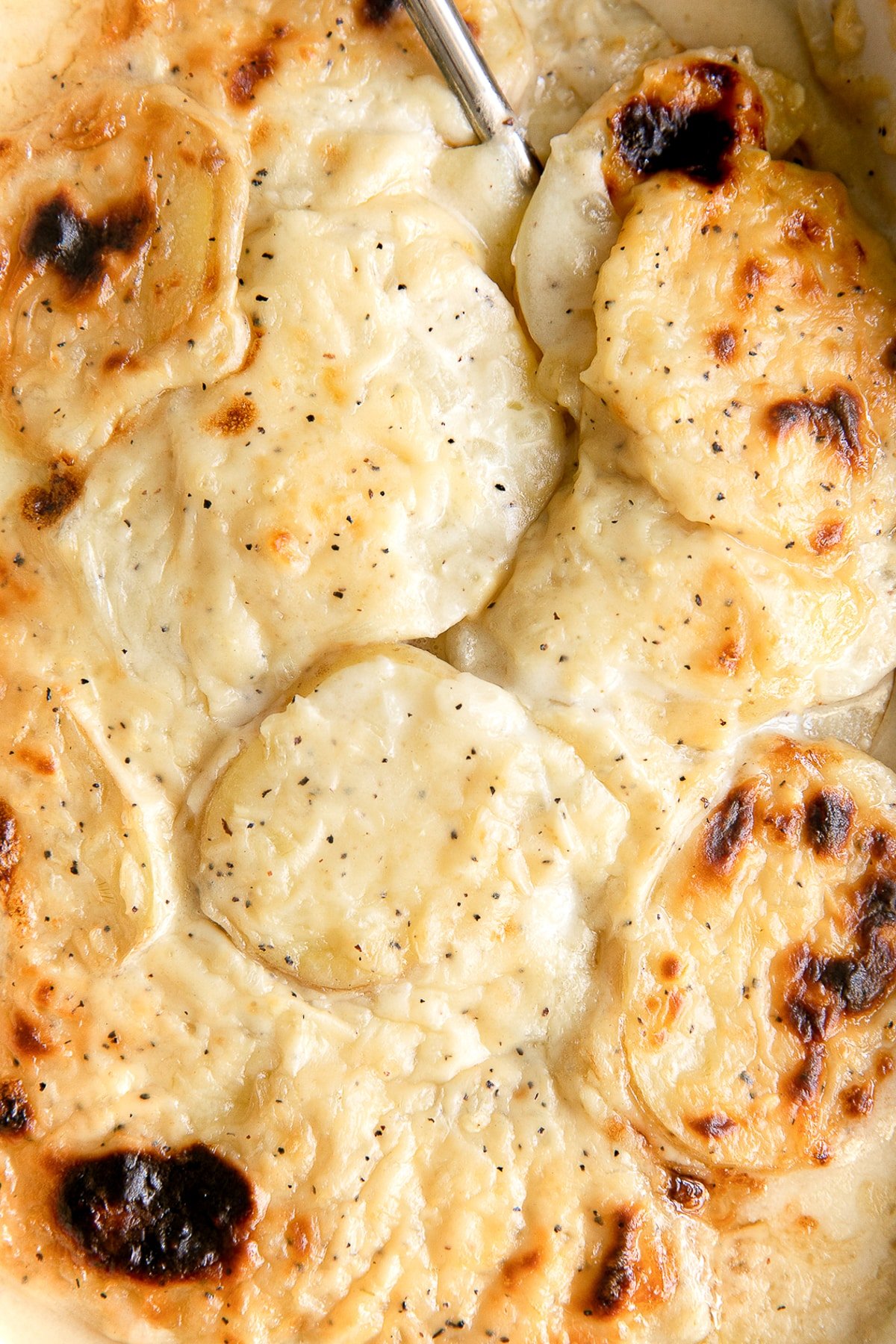 Thinly sliced potatoes and tender onions are layered in a homemade cream sauce and baked until golden and bubbly. Love cheese with your potatoes? Try my cheesy scalloped potatoes instead.