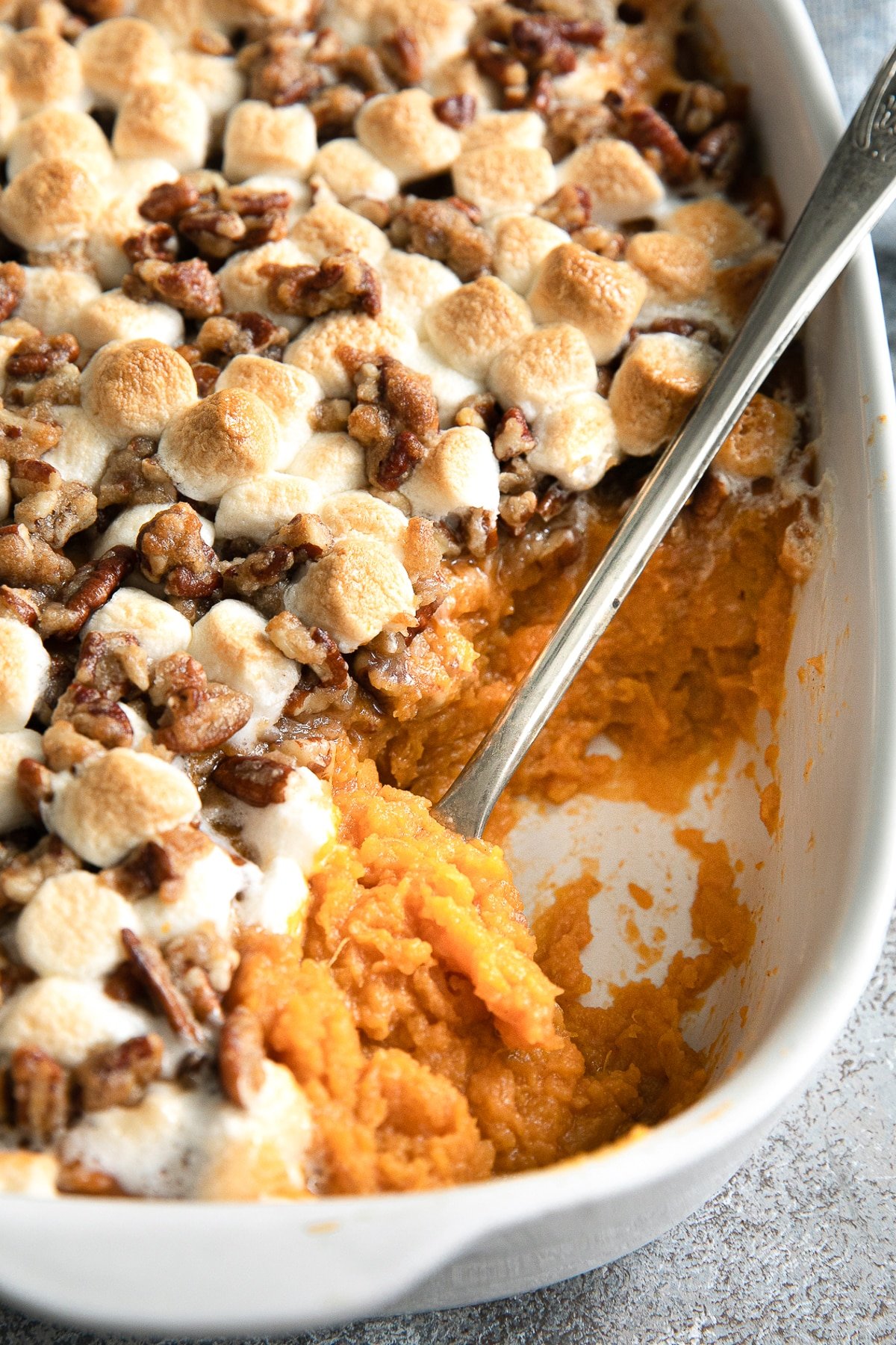 A quintessential Thanksgiving side dish made with creamy mashed sweet potatoes topped with golden marshmallows and crunchy pecans. You can also bake it in single serving ramekins for a more elegant presentation.