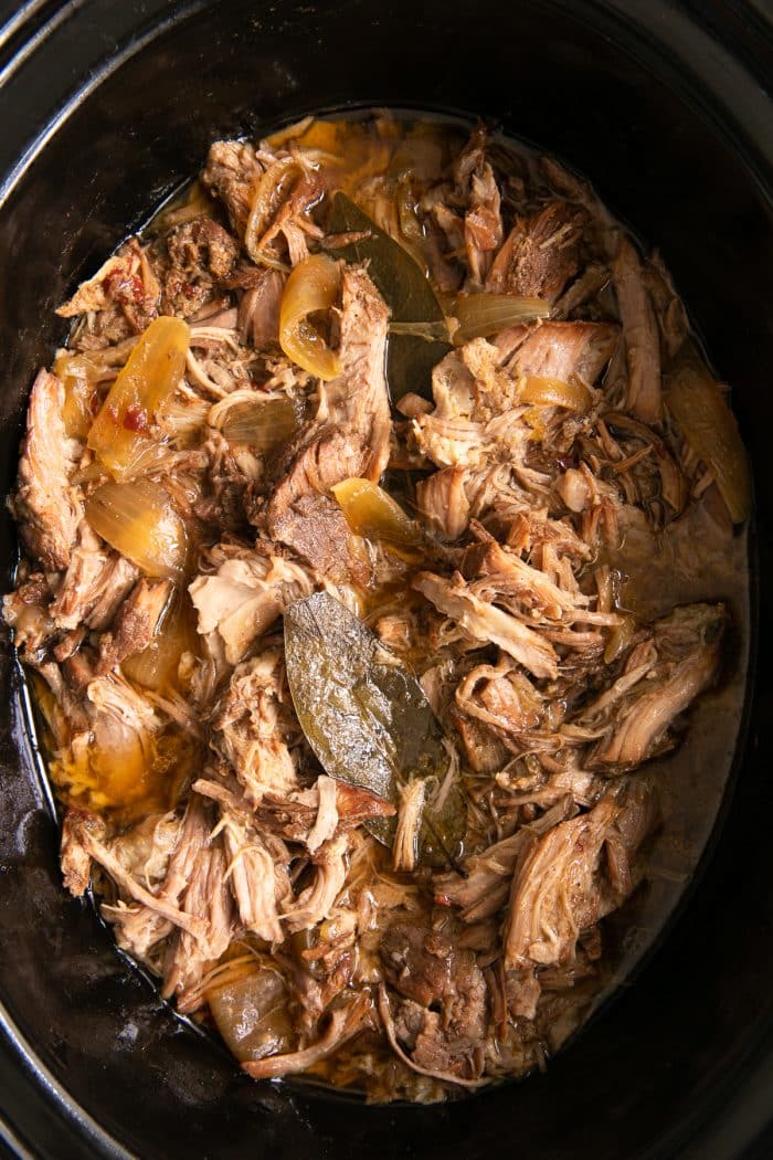 - Layer with flavors. Rub the pork with salt and pepper before adding it to the slow cooker and topping it with sliced onion and bay leaves. Combine the Mexican oregano, ground cumin, minced garlic, chili powder, orange juice, lime juice, chipotles in adobo, and chicken broth (or light Mexican beer) in a medium bowl and pour it over the pork.