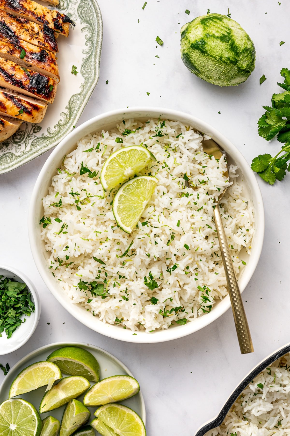 - Coconut Milk: For a slightly richer, creamier version of this cilantro lime rice, replace half of the water with full-fat canned coconut milk. It adds a subtle coconut flavor that pairs especially well with Thai-inspired dishes, grilled citrus-marinated chicken, or bowl-style meals like this teriyaki chicken bowl and bang bang salmon bites. Love coconut? Try my rich and creamy coconut rice recipe next!
