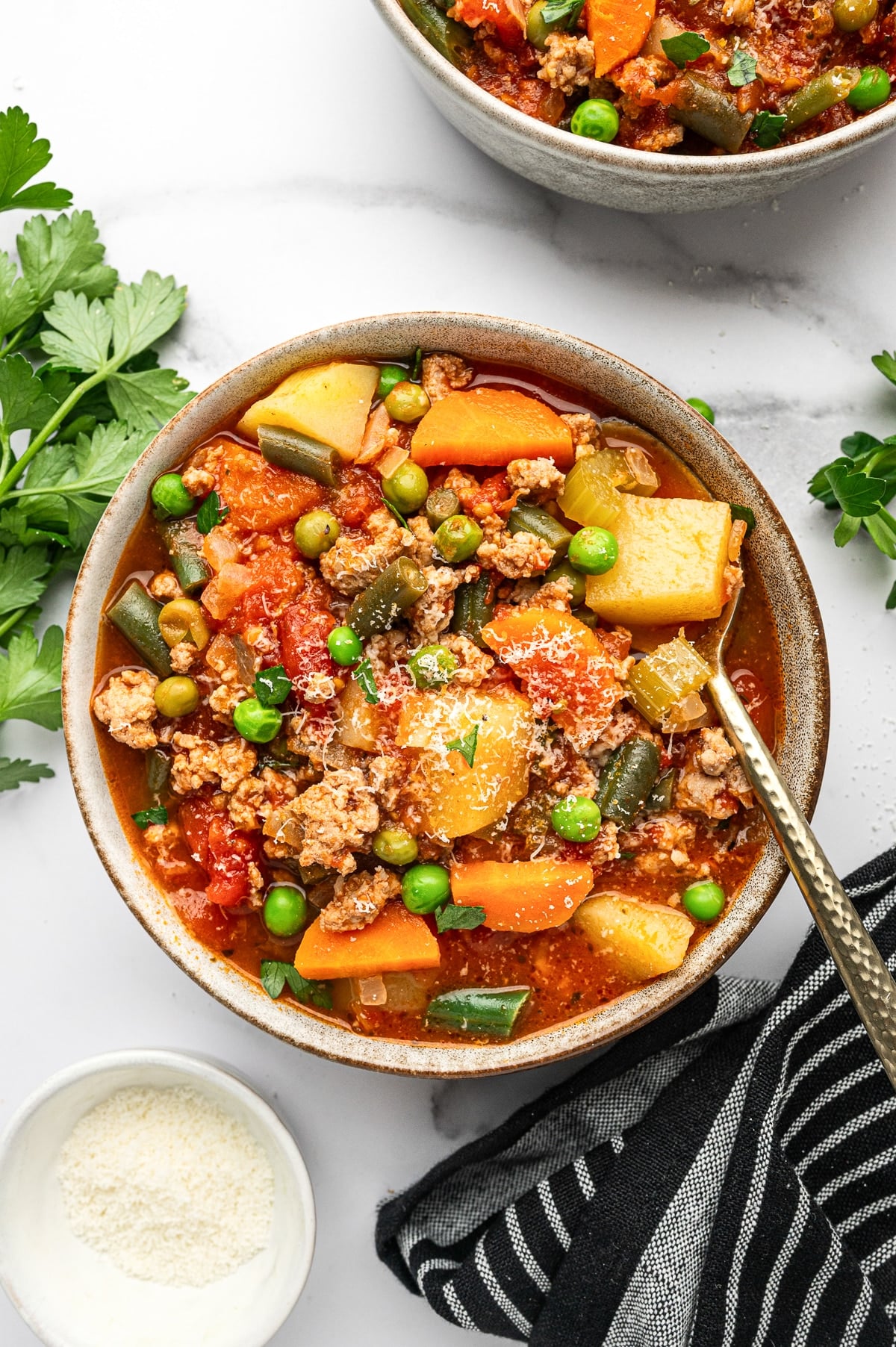 Made with simple pantry staples, this ground turkey soup features a combination of fresh and frozen veggies, canned tomatoes, tomato paste, and Italian seasoning. It’s such an easy comfort food and perfect when you need something quick and delicious for dinner.