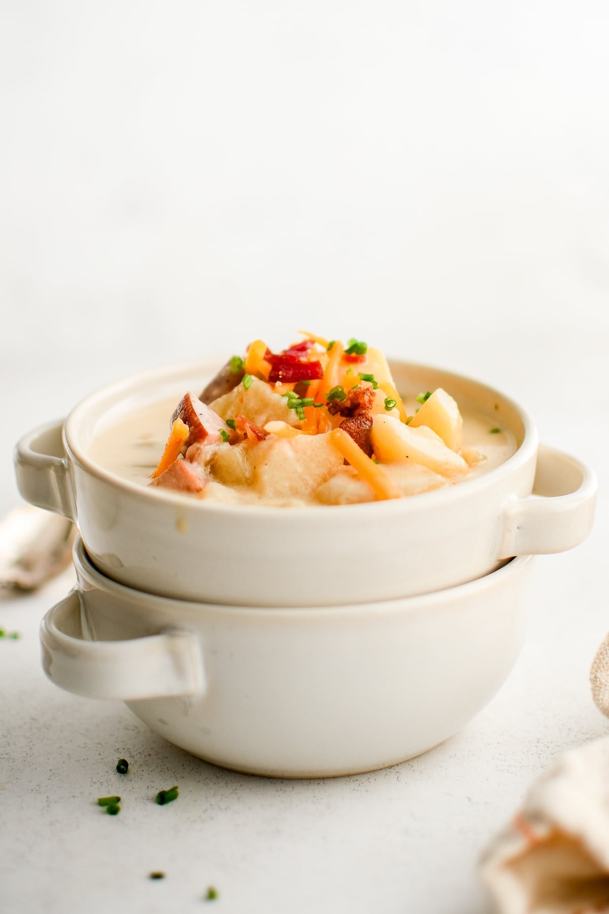 Ham – Ham is what makes this chunky potato soup so irresistible! In this recipe, we’re browning the diced ham first to infuse savory, smoky flavor throughout the entire pot. If you have leftover honey baked ham, this is the perfect recipe for it! Otherwise, a ham steak (sold at most grocery stores) works just as well. Substitute: Smoked sausage, bacon, or even ground sausage are great ham replacements.